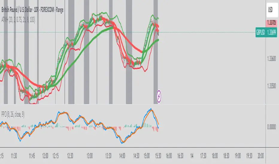 Updated to have color changes on all the EMA settings green for BUY and red for SELL. I use the PPO chart for confluence also. Sometime exit the squeeze is a good time to enter. I change the EMA 360 setting depending on the time period. on 10R use 100. Also use the PPO signal cross over the zero (0.0000) for alerts. Any feedback would be appreciated. Prosperous New Year to all!Script de código abierto