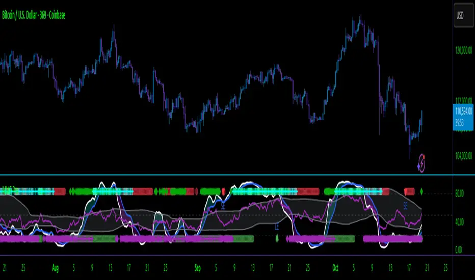 Momentum without RSI or WaveTrend clones: The oscillator is built from a detrended price base (TP = H+L+C / 3 minus its EMA). That detrended series is normalized by a rolling z-score and mapped through a logistic function into 0–100. Two independent waves (fast/slow) are derived from this base, producing momentum cross and regime signals without borrowing RSI or open-source WaveTrend code.