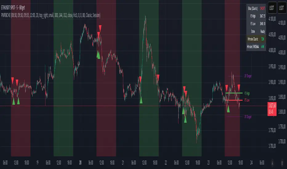 Intraday traders often get whipsawed by early noise or by fast flips in trend filters. This script commits to a bias at a single premarket minute and then waits for the market to present an objective structure: the first-five range. Breaks after that window are clearer and easier to manage. The alternative SWDEMA regime gives a slower, latched context for users who prefer a trend scaffold rather than a midpoint reference.