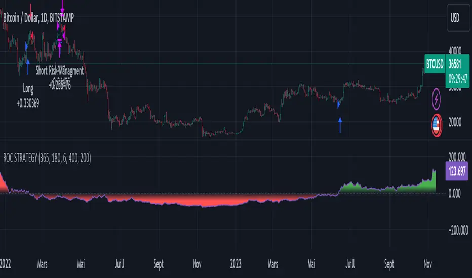 We are in a LONG position if ROC (365) > 0 for at least two days. This allows us to limit noise and irrelevant signals to ensure that the ROC remains positive.