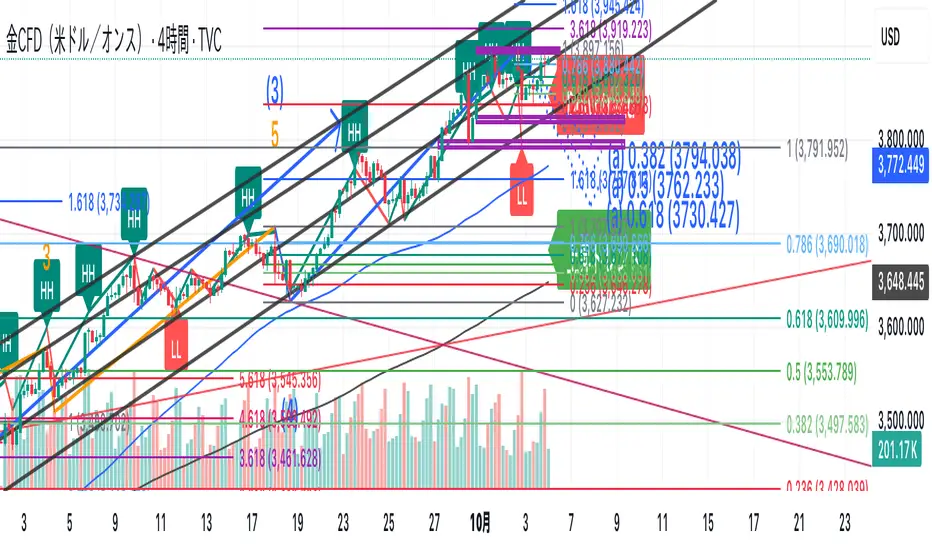 下位足では本インジのHL/LH→HH/LLの継続サインを待って、EMA帯の押し/戻りで入る。