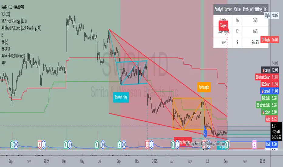 This indicator calculates the probability of the current stock price reaching or exceeding the analyst-provided high, average, and low price targets within a one-year time horizon. It utilizes a geometric Brownian motion (GBM) model, a standard approach in financial modeling that assumes log-normal price distribution with constant volatility.
