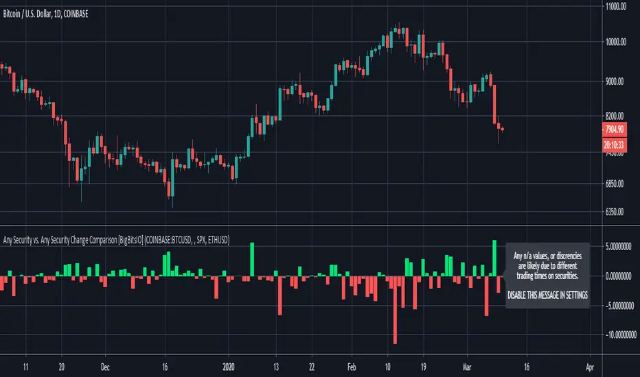 This script allows you to compare the percentage-based change in the price of any two securities on any given (and supported) timeframe on the chart. This can give you a very simple way to compare any two securities against one another.