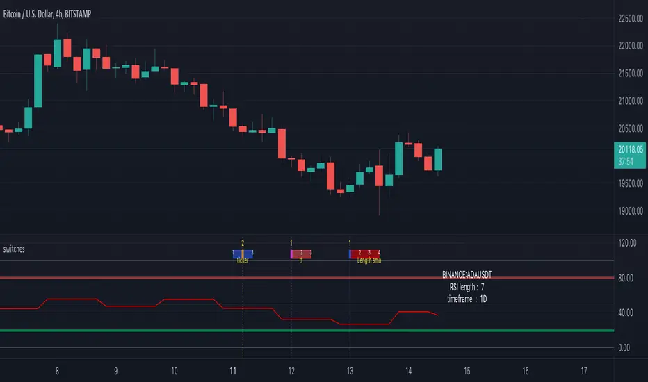 In this case you can switch between a RSI of 3 different tickers, 3 different higher timeframes, and 4 different lengths.