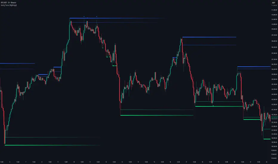 The Swing Traces [BigBeluga] indicator is a powerful tool for mapping price memory. By projecting recent swing highs and lows forward and fading them over time, it helps traders see where price may react, consolidate, or break through with strength. Its dynamic traces and breakout labels make it especially useful for swing traders, breakout traders, and liquidity hunters.