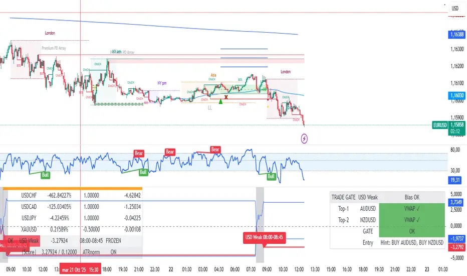 Shows Verdict (USD Strong/Weak), Bias OK/weak (|Score| vs your threshold), Top-1/Top-2 VWAP checks, an overall GATE: OK/NO, and an Entry hint string (e.g., “SELL EURUSD, BUY USDCHF”) when conditions align.