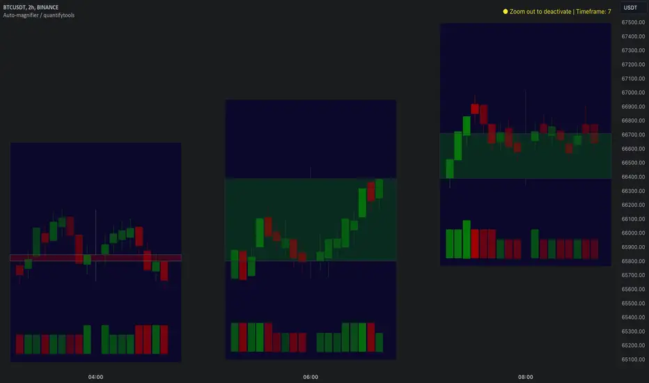 Auto-magnifier shows a lower timeframe view of candles and volume bars inside any main timeframe candle by zooming into it. Candles and volume bars as they develop are shown chronologically from left to right. By default, magnifier is triggered when less than 3 candles are visible on the chart.