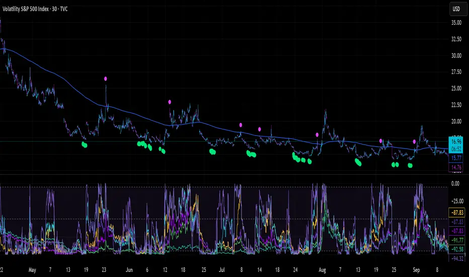 Green dots🟢appear below the bar when all %R series agree the VIX is extremely oversold.