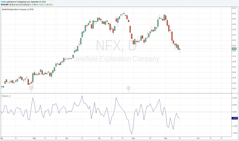 The slope indicator measures the rise-over-run of a linear regression, which is the line of best fit for a price series. Fluctuating above and below zero, the Slope indicator best resembles a momentum oscillator without boundaries. It is not well suited for overbought/oversold levels, but can measure the direction and strength of a trend. It can also be used with other indicators do identify potential entry points within an ongoing trend. (stockcharts.com/school/doku.php?id=chart_school:technical_indicators:slope)
