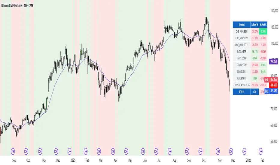 Compare the relative and actual performance of up to 15 tickers against the current market being charted across multiple timeframes. Customisable look back periods and alerts configured. All data is displayed in a dynamic table for the market selected.Script protegido