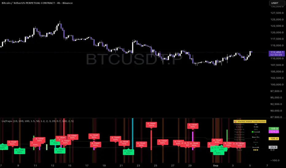 LiqTrap+ is an advanced liquidity & reversal detector designed for scalpers, swing traders, and smart-money style traders. It tracks liquidation flows, stop hunts, and institutional orderflow footprints to identify high-probability reversal and trap zones.