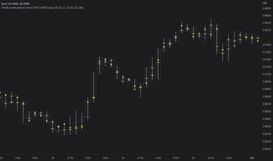 TPOC (time point of control) and VPOC (volume point of control) are points in price where highest amount of time/volume was traded. This is considered key information in a market profile, as it shows where market participant interest was highest. Unlike full fledged market profile that shows total time/volume distribution, this script shows the points of control for each candle, plotted with a line (time) and a dot (volume). The script hides your candles/bars by default and forms a line in the middle representing candle range. In case of candles, borders will still be visible. This feature can be turned off in the settings.