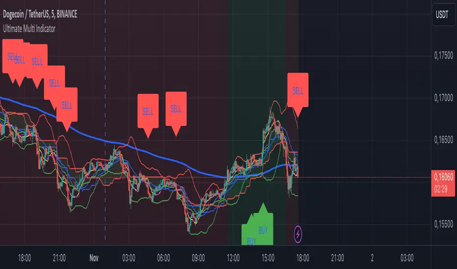 This custom indicator, the Ultimate Multi Indicator, integrates multiple trading indicators to have powerful buy and sell signals. I combined MACD, EMA, RSI, Bollinger Bands, Volume Profile, and Ichimoku Cloud indicators to help traders analyze both short-term and long-term price movements.