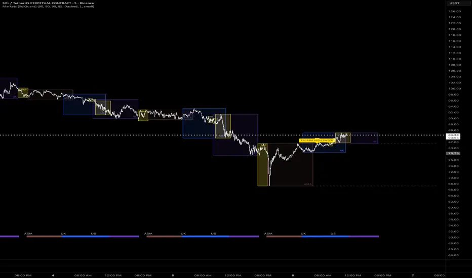 The Markets [SolQuant] indicator displays global trading session times with visual range boxes and highlights market maker activity zones. It maps the three major sessions — New York, London, and Asia — along with specialized zones that have been observed to correlate with specific market behaviors.