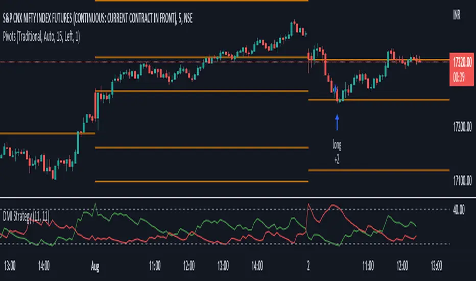 This strategy is based on DMI indicator. It helps me to identify base or top of the script. I mostly use this script to trade in Nifty bank options, even when the signal comes in nifty. It can be used to trade in other scripts as well. Pivot points can also be used to take entry. Long entry is taken when DI+(11) goes below 10 and DI-(11) goes above 40, whereas short entry is taken when DI-(11) goes below 10 and DI+(11) goes above 40.