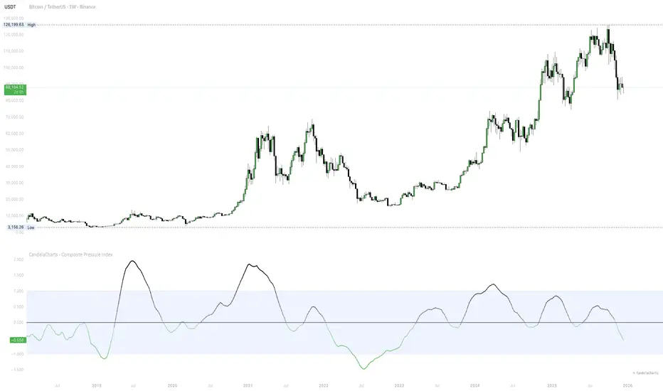 The CandelaCharts – Composite Pressure Index (CPI) is a multi-factor oscillator that blends RSI, Money Flow Index (MFI), and Chaikin Money Flow (CMF) into a single, stretchable “pressure” line. Instead of looking at three separate indicators, CPI compresses price momentum and volume flow into one normalized curve around 0, then amplifies extremes using a rolling z-score.