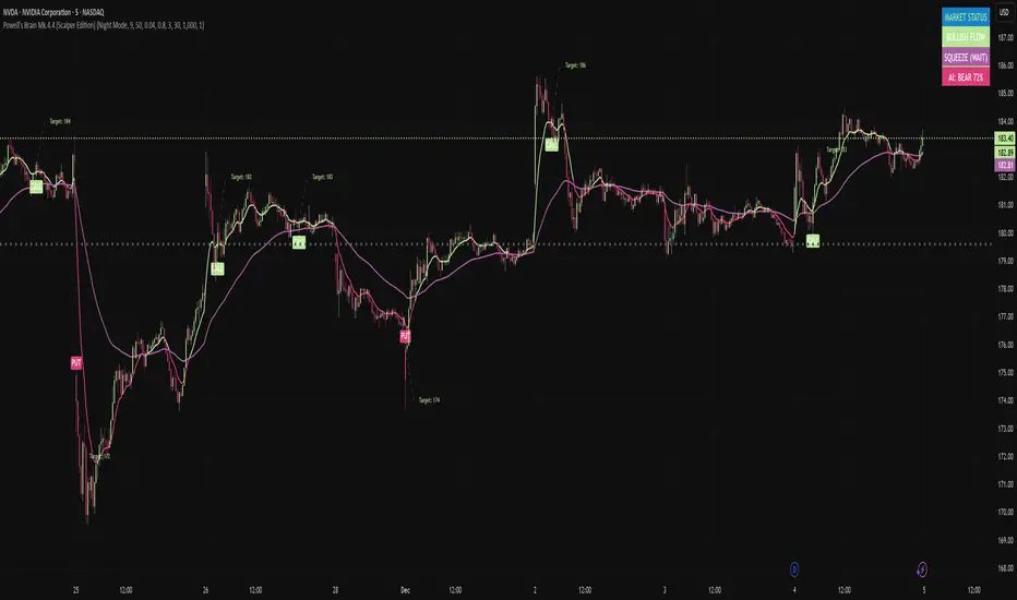 Powell's Brain is a mechanical scalping system designed for volatile assets (like SPY, QQQ, NVDA, and TSLA) on 1-minute and 5-minute timeframes.