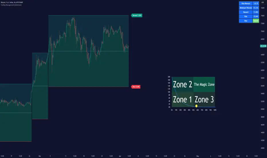 The Trailing Management (Zeiierman) indicator integrates a Break-Even Curve feature to enhance its utility in trailing stop management and risk-reward optimization. The Break-Even Curve illuminates the precise point at which a trade neither gains nor loses value, offering clarity on the risk-reward landscape. Furthermore, this precise point is calculated based on the required win rate and the risk/reward ratio. This calculation aids traders in understanding the type of strategy they need to employ at any given time to be profitable. In other words, traders can, at any given point, assess the kind of strategy they need to utilize to make money, depending on the price's position within the risk/reward box.