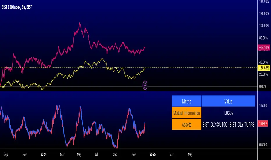 This script calculates the Mutual Information (MI) between the closing prices of two assets over a defined lookback period. Mutual Information is a measure of the shared information between two time-series datasets. A higher MI indicates a stronger relationship between the two assets.
