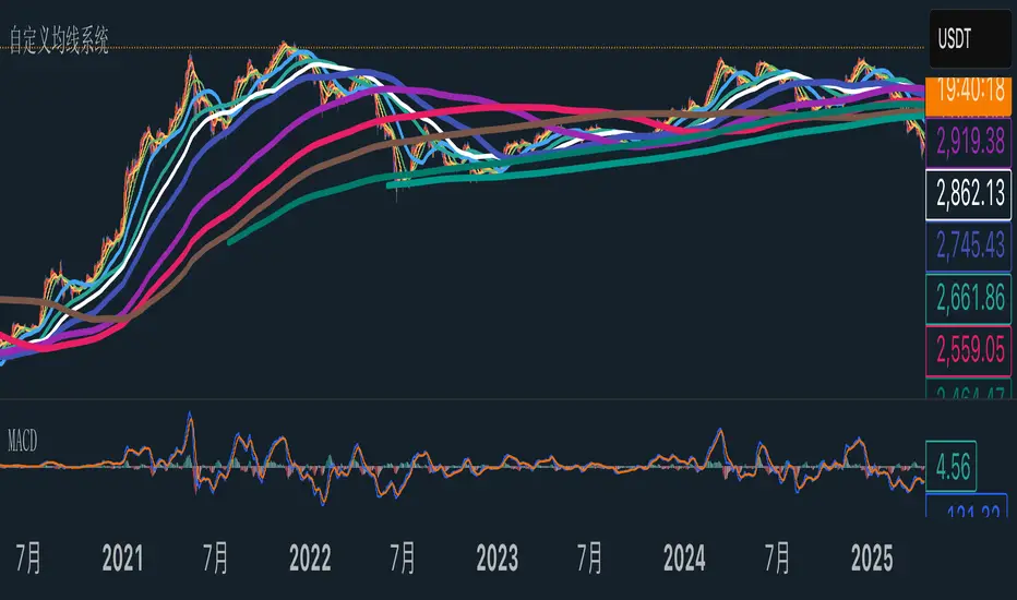 这是一个叠加在价格上的 SMA 均线组,从 MA5 到 MA4320。为每条均线设置了 独立颜色,并按 周期长度分级线宽(短=细、中=中等、长=较粗),让趋势结构一眼可读。