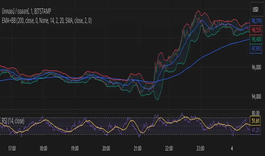 - If Bollinger Bands are enabled, the script computes the standard deviation of the EMA over the smoothing period, multiplies it by the specified multiplier, and then plots an upper and lower band around the smoothing MA.
