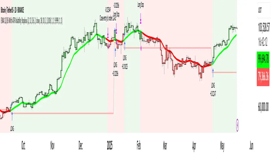 The EMA 12/26 With ATR Volatility Stoploss strategy is built on the premise of capturing short- to medium-term price trends with a high degree of automation and consistency. It leverages the crossover of two EMAs—a fast EMA (12-period) and a slow EMA (26-period)—to generate buy and sell signals, which indicate potential trend reversals or continuations. To mitigate the inherent risks of trading, the strategy incorporates the ATR indicator to set stop-loss levels that adapt to market volatility, ensuring that losses remain within acceptable bounds. Furthermore, it calculates position sizes based on a user-defined risk percentage, safeguarding capital while optimizing trade exposure.