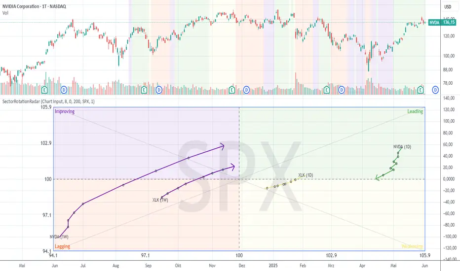 The Sector Rotation Radar is a powerful visual analysis tool designed to track the relative strength and momentum of a stock compared to a benchmark index and its associated sector ETF. It helps traders and investors identify where an asset stands within the broader market cycle and spot rotation patterns across sectors and timeframes.