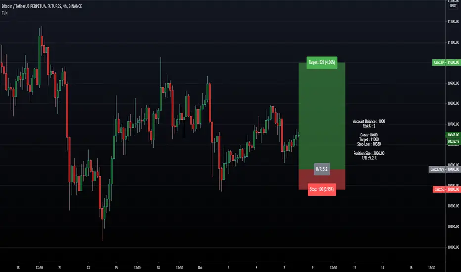 This is a script to make calculating position size easier. It calculates position size as a percentage of account balance and Risk/Reward based on input values of entry, exit, stoploss and shows the R/R box similar to tradingview's R/R tool. There is an option to toggle showing label and choosing of label text color.