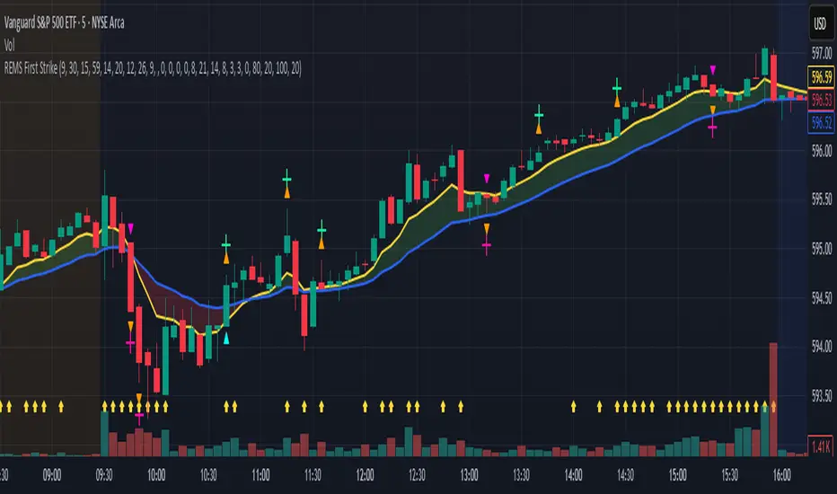 The REMS First Strike indicator is a multi-factor, confluence-based system that combines momentum (RSI, Stochastic RSI), trend (EMA, MACD), and optional filters (volume, MACD histogram, session time) to identify high-probability trade setups. Signals are only triggered when all enabled conditions align, giving the trader a filtered, visually clear entry signal.