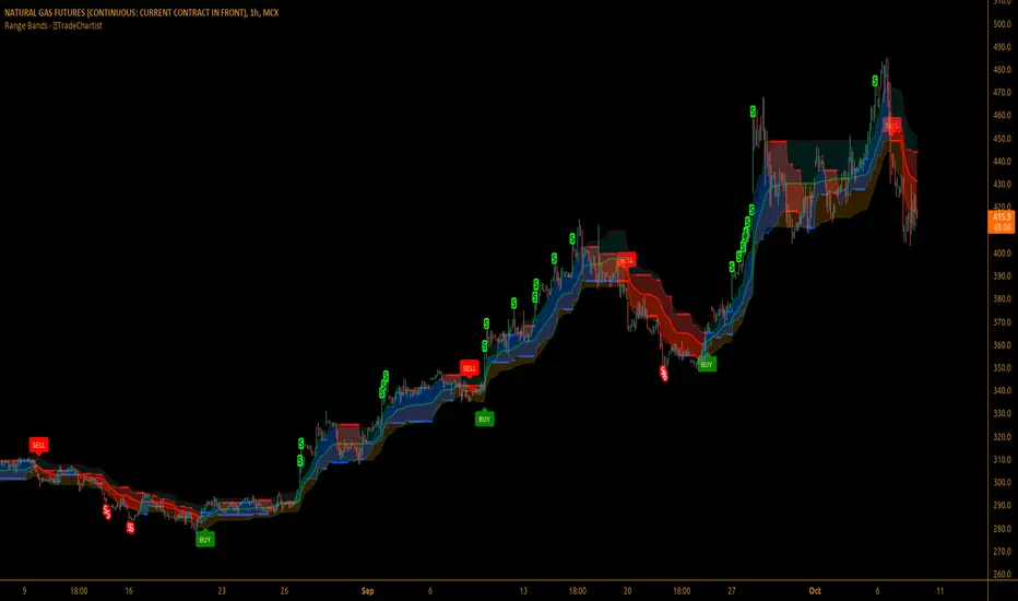 - The Indicator plots Range Bands with Upper, Lower and Mean, calculated using trading models that use both Trend Following and Mean Reversion principles . It is the Range Bands that decide the trade Entries as the breakouts above upper band generates long entries and the breakouts below the lower band generates the short entries.