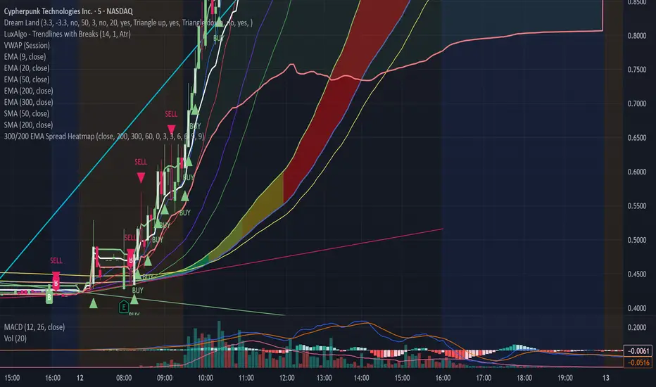 Highlights the difference between 300 and 200 EMA to indicated potential over extensions in breakout structures.