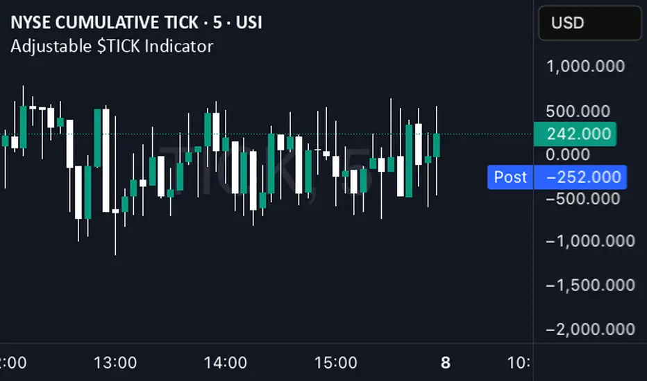 - Adjustable Moving Average: Plots a customizable moving average (SMA, EMA, WMA, VWMA, SMMA, HullMA) with user-defined length (default: 14) to smooth Tick data and highlight trends.