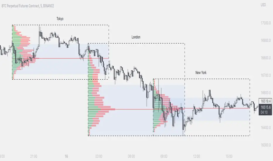 This script allows you to keep track of Forex market sessions (Tokyo, London and New York), as well as Daily, Weekly and Monthly sessions. All of them are accompanied by Volume Profile options where you can view VP Histogram, Point of Control, Value Area High and Value Area Low.