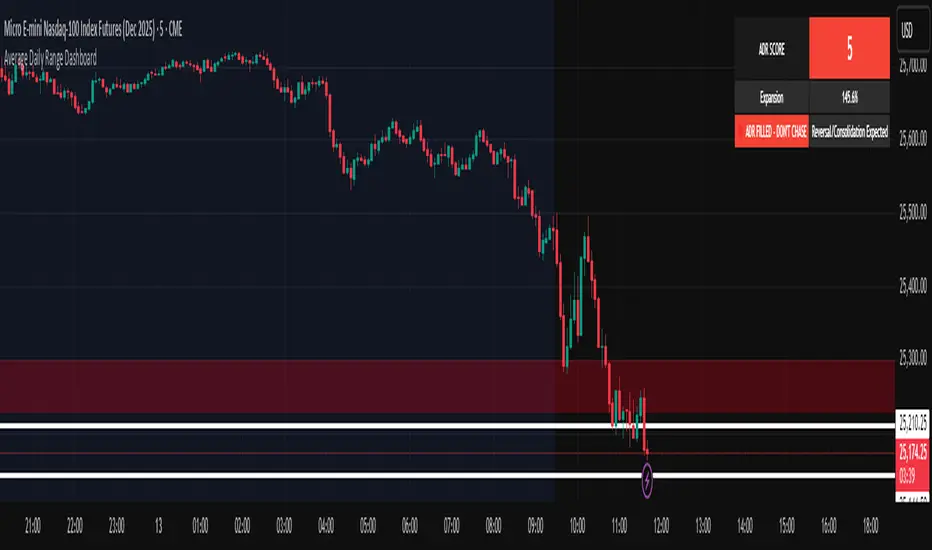 This script displays a non-intrusive ADR (Average Daily Range) dashboard designed to assist traders in monitoring real-time range expansion throughout the trading session. It compares the current day's high-low range to the average daily range calculated over a user-defined number of previous completed days (default: 5).