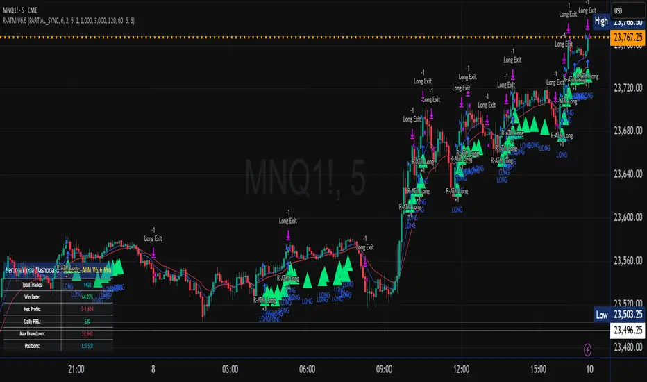 Professional algo system combining 4 proven indicators: R-ATM KISS V5 trend detection, LG_TRSpeed momentum analysis, R-ATM Oscillator scoring, WaveTrend wave analysis. Features 3 signal modes (ALL_IMMEDIATE/ALL_SYNC/PARTIAL_SYNC), advanced risk mgmt with stop-loss/profit targets, daily P&L limits, position controls, and volatility filtering. Real-time dashboard tracks trades, win rate, profit/loss, and drawdown. $300/month subscription, 21-day FREE trial, cancel anytime. 3+3 months free when paying quarterly. Educational purposes only. Past performance doesn't guarantee future results. Trading involves substantial risk. Only trade with capital you can afford to lose. Contact: support@robotic-atm.com | robotic-atm.com | Robotic-ATM Inc.