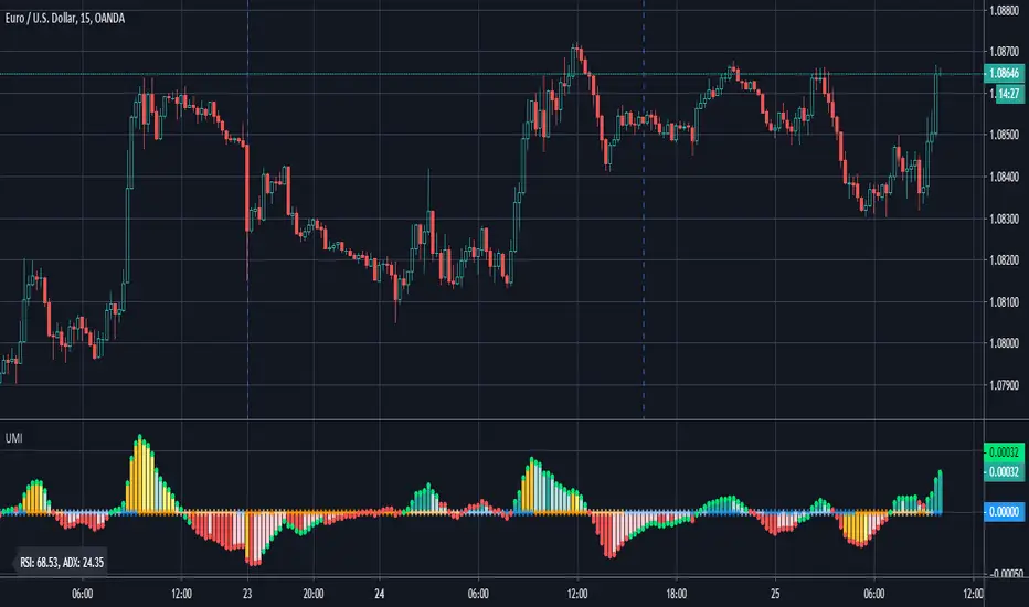 - ADX: Crosses are drawn along the 0 line to indicate ADX. Blue means the ADX is below the trending level (adjustable in the settings), and orange means it is above that level. Darker colors indicate the ADX has gone up since the previous bar, while lighter colors indicate it has gone down. The actual ADX value is also shown in the label to the left side of the indicator.