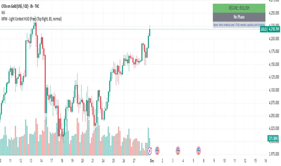MFM Light Context HUD is the free version of the Market Framework Model. It gives you a fast and clean view of the current market regime and phase without signals or chart noise. The HUD shows whether the asset is in a bullish or bearish environment and whether it is in a volatile, compression, drift, or neutral phase. This helps you read structure at a glance.