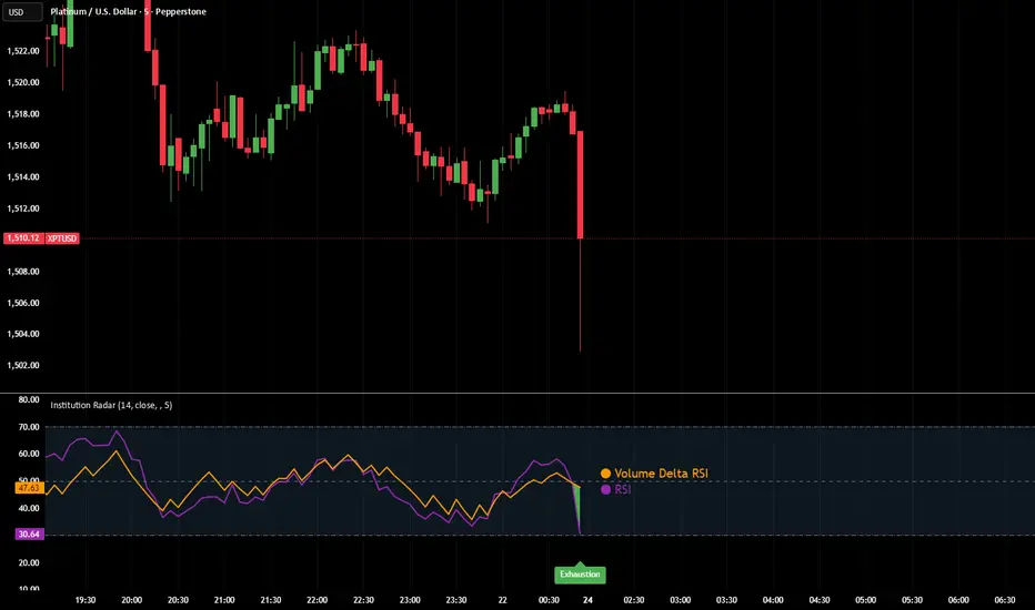 Institution Radar compares Price RSI with Volume-Delta RSI to show when price moves are real (backed by volume) or fake (moving without volume).