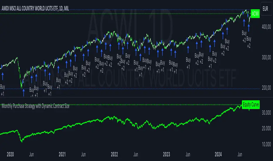The "Monthly Purchase Strategy with Dynamic Contract Size and Drawdown" provides a disciplined approach to investing by automating purchases and adjusting position sizes based on portfolio equity. It leverages the benefits of dollar-cost averaging and regular investment, with risk management through drawdown monitoring. Scientific literature supports the effectiveness of ETF savings plans and automated investment strategies in optimizing returns and managing investment risk.