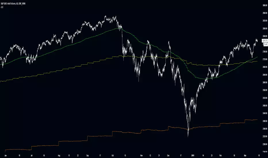 This multi-timeframe 50-period exponential moving average uses an improved calculation to accurately calculate the indicator's value with every new bar on the time frame your chart is set to. Previously the indicator only recalculated with every new update on the timeframe used in its security function. This means that this improved script plots the real, current value of your indicator across your chosen timeframes on your chart's resolution and no longer only plots only the indicator's monthly/weekly/daily/4 hour/ect closing value on the your chart.