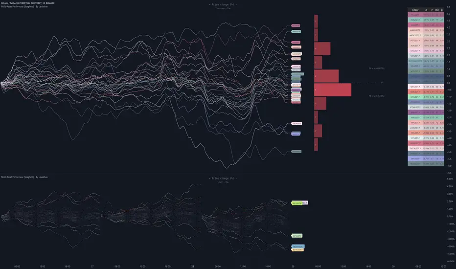 Multi Asset Performance indicator (also called “Spaghetti”) makes it easy to monitor the changes in Price, Open Interest, and On Balance Volume across multiple assets simultaneously, distinguish assets that are overperforming or underperforming, observe the relative strength of different assets or currencies, use it as a tool for identifying mean reversion opportunities and even for constructing pairs trading strategies, detect "risk-on" or "risk-off" periods, evaluate statistical relationships between assets through metrics like correlation and beta, construct hedging strategies, trade rotations and much more.
