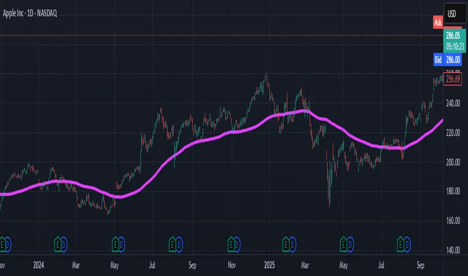 This indicator plots up to three adaptive “Magic MAs” plus a weighted combo line, with optional traditional SMAs for comparison.