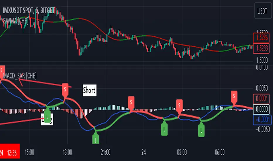 "The whole is greater than the sum of its parts." The "MACD with SAR Indicator" is an innovative technical analysis tool that combines the strengths of the Moving Average Convergence Divergence (MACD) indicator with the Parabolic Stop and Reverse (SAR) indicator. This indicator provides traders with an enhanced method to detect trend changes and determine optimal entry and exit points in the market by using the SAR based on the MACD line to better identify reversal points. The combination generates clear trend reversal signals, which are visually represented through long (L) and short (S) signals on the chart.
