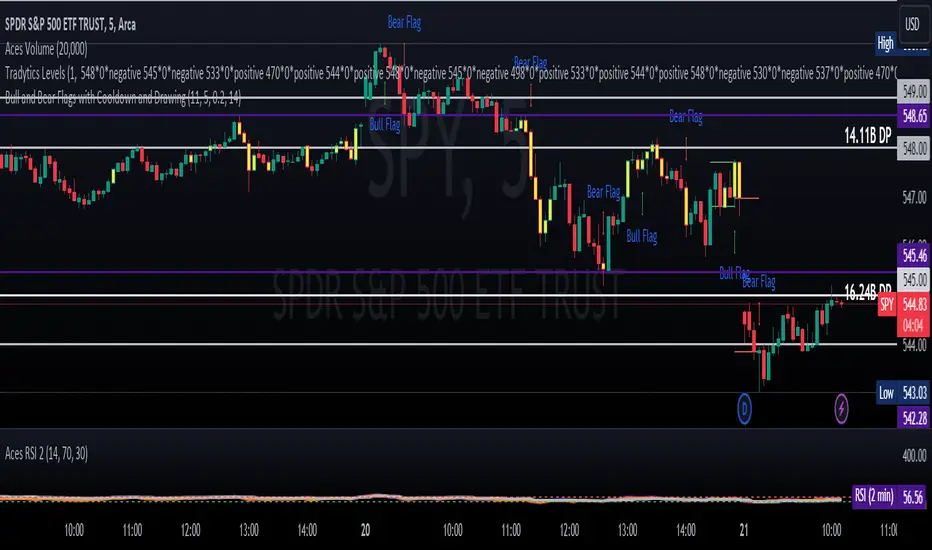 This Pine Script is designed for the TradingView platform to identify and visually highlight specific technical chart patterns known as "Bull Flags" and "Bear Flags" on financial charts. These patterns are significant in trading as they can indicate potential continuation trends after a brief consolidation. The script includes mechanisms to manage signal frequency through a cooldown period, ensuring that the trading signals are not excessively frequent and are easier to interpret.