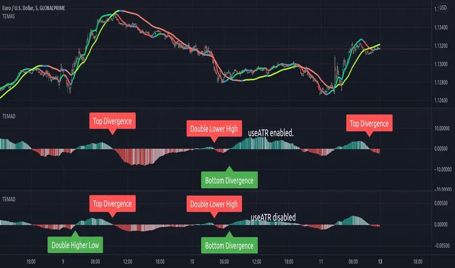 Calculate TEMA difference and display Divergence and Double HH/LL when cross happened.