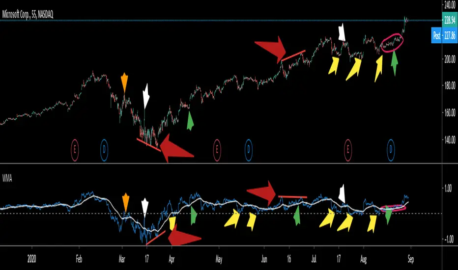 WMA at zero, or very close to it, in pullback (Yellow Arrows).