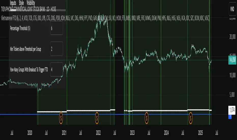 A Pine Script implementing William O'Neil’s Follow Through Day (FTD) strategy for the Vietnamese stock market. It scans 7 predefined sector groups (Banks, Real Estate, Retail, etc.) to detect momentum breakouts.