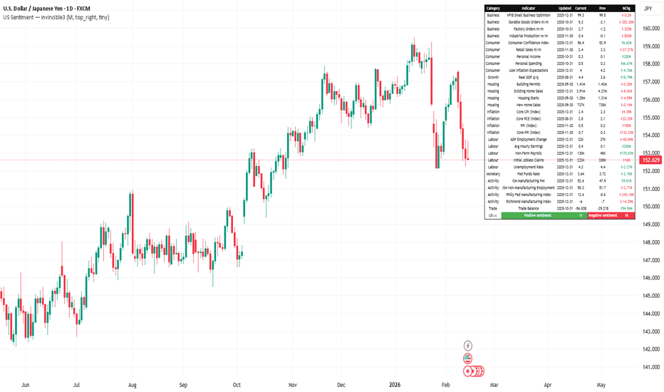 US Sentiment -invincible3US Sentiment — invincible3 is a macro dashboard table that tracks key U.S. economic indicators (FRED + TradingView ECONOMICS series) and converts their latest changes into a simple bullish / bearish / neutral sentiment signal. It helps traders quickly understand whether the macro backdrop is improving or deteriorating — without switching between multiple charts.