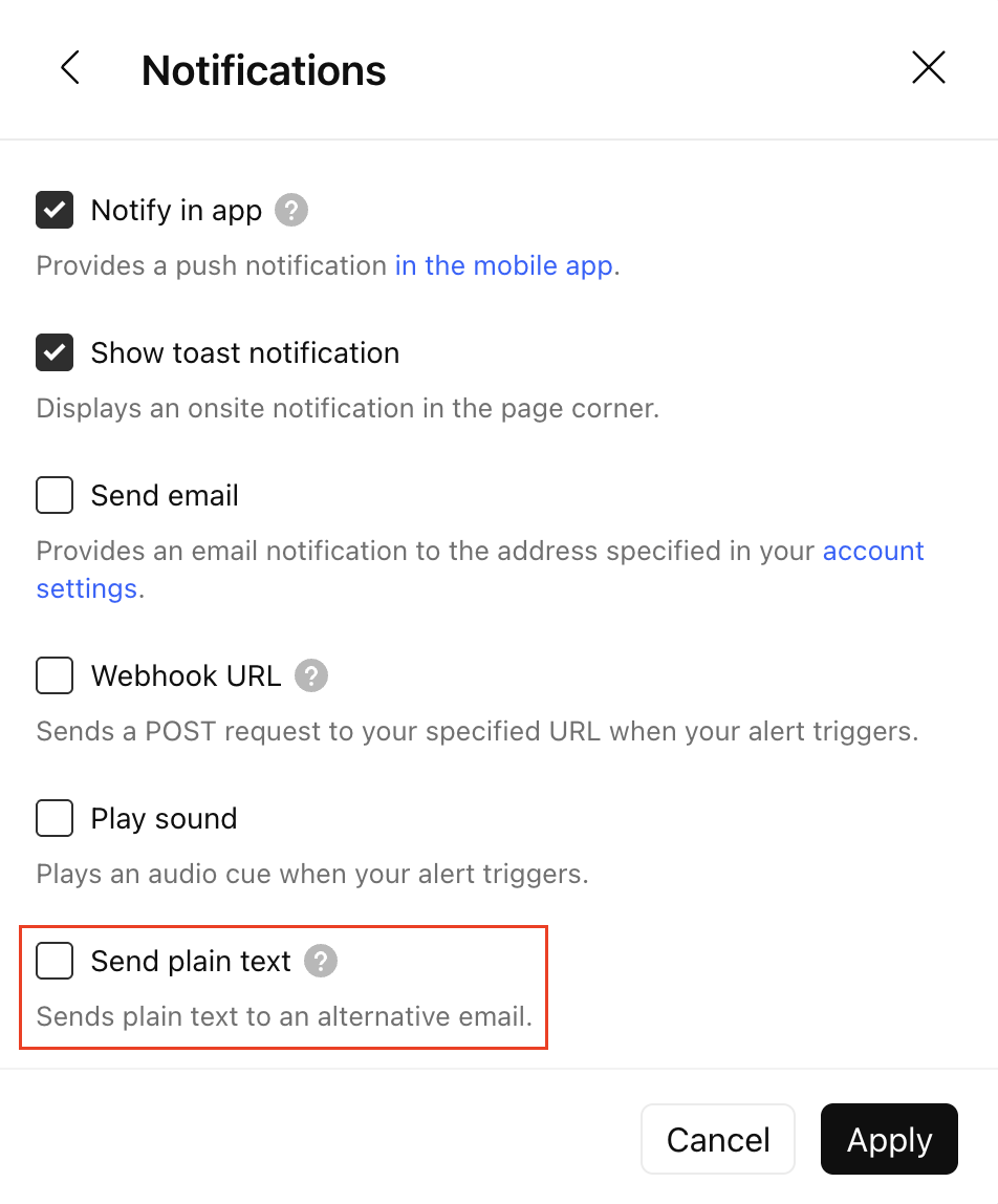 Puede utilizar un correo electrónico alternativo si desea recibir las notificaciones de sus alertas en otra dirección de correo electrónico. Solo tiene que marcar la casilla Enviar texto sin formato en el cuadro de diálogo de configuración de alertas y especificar la dirección de correo electrónico que desea utilizar.