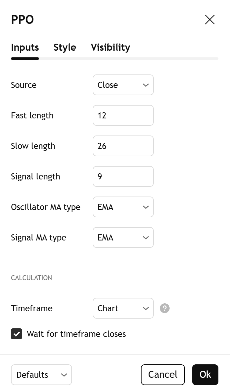 Especifica qué tipo de media móvil aplica el indicador al PPO para calcular la línea de señal. Seleccione «EMA» para una media móvil exponencial o «SMA» para una media móvil simple.